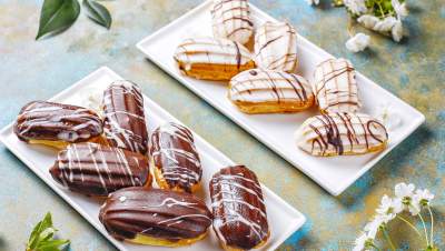Mini eclere umplute cu crema de vanilie si glazurate cu ciocolata alba si neagra